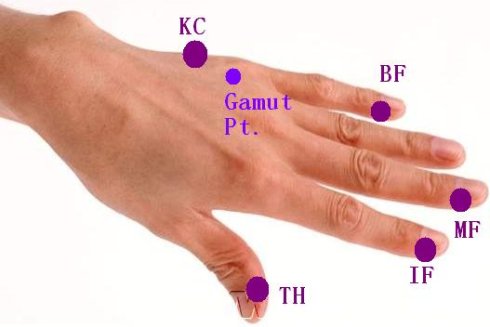 首先你要先找到the Gamut Point的位置。它就位于两手掌的背部,无名指与小拇指指关节中央的后面1/2吋之处。接下来,你必须进行9项不同的步骤,并且持续地拍打the Gamut Point。这9个步骤分别是: